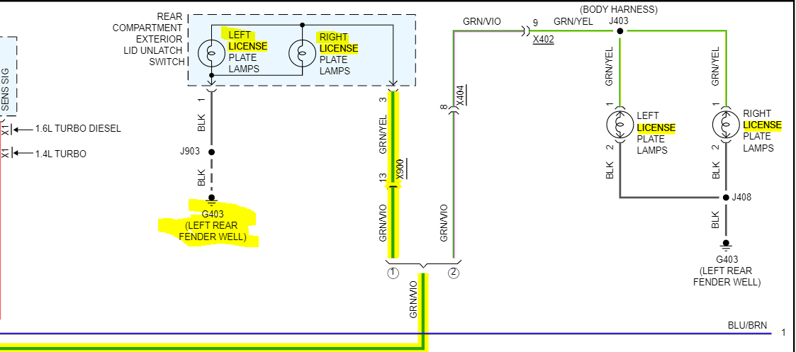 I attached the schematic below at the license plate lamps. This is very straightforward. What I need you to do is check for power.