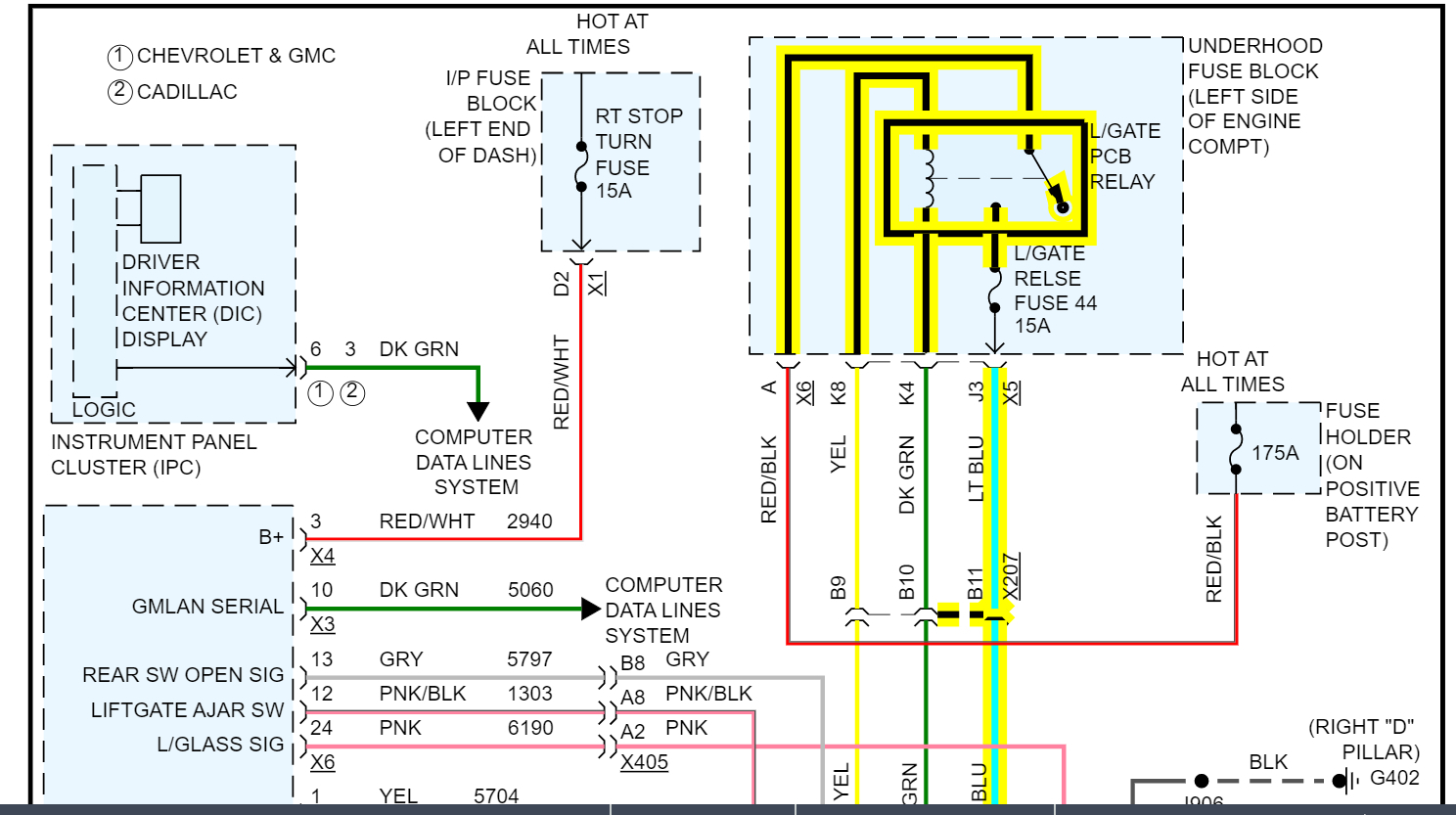 Hi, I seen that you responded to a previous person close to my subject, I'm not getting power to fuse 44 which states it's the lift gate fuse but getting consistent power to other fuses LGM under hood and OBS Det in car, as well as BCM. from what I'm told fuse 44 gets power from 175 little fuse coming from battery... possible short or is this fuse intermittent? Tried hitting key fob and buttons to see if 12-volts will pass through it but nothing.