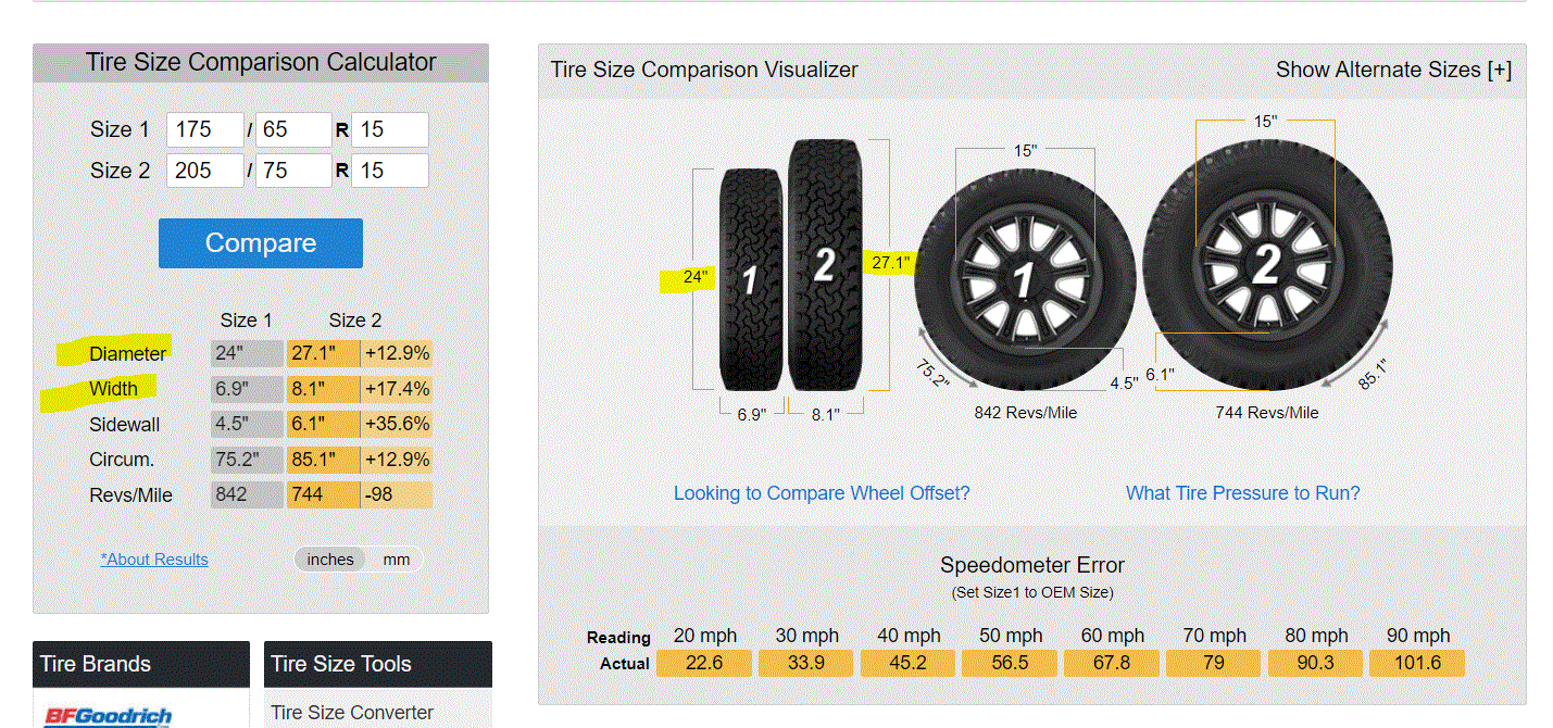 Don't laugh, but you should have 2 extra inches to work with. My biggest concern isn't necessarily the height but if a larger tire will hit the inner fender or fender itself when turning. So be aware of that. Now, when I try to determine tire size variance, there is a site I use that shows a side by side comparison of tires sizes. What I want you to try is this. Place the OEM tire size in tire size 1. Then start changing the 2nd size until you see an overall diameter that you feel will fit. For example, compare a 175/65/15 to a 205/65/15. The site will actually tell you how the size difference affects even the rotations of the tire per mile. Please keep in mind, using a larger tire will change the accuracy of the speedometer.