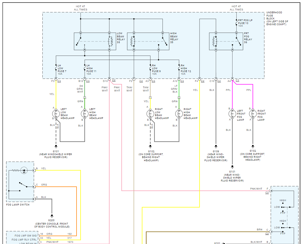 Starting with the headlamps, the low beam power supply is provided by a yellow wire. So, when you have the low beam turned on, that wire should have power.