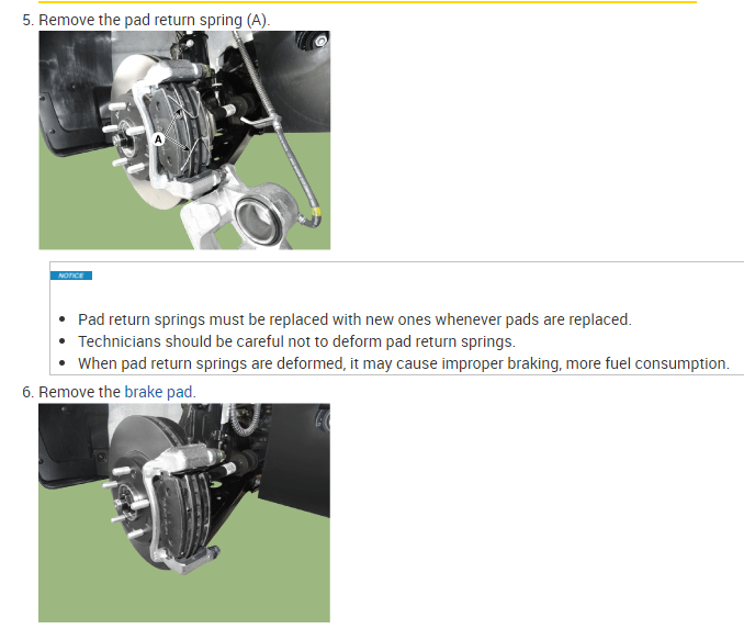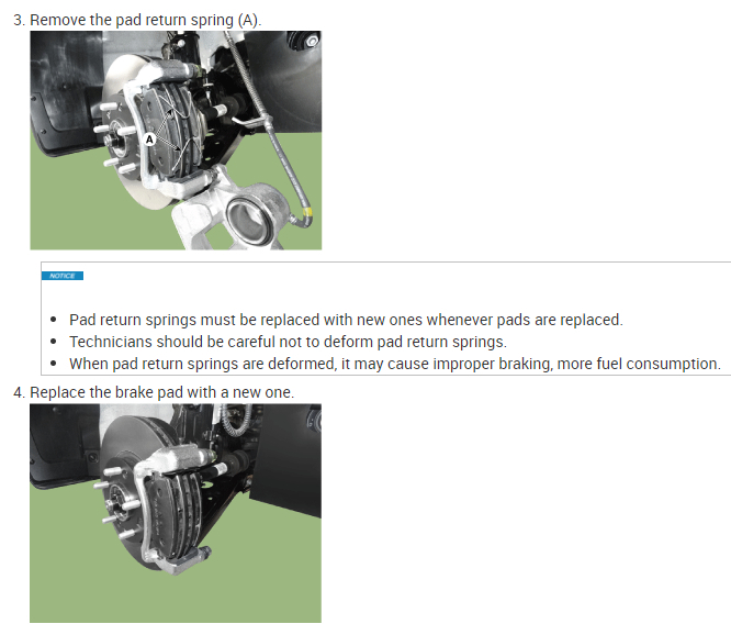 When pad return springs are deformed, it may cause improper braking, more fuel consumption.