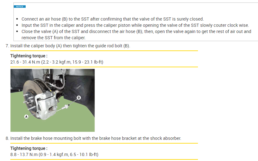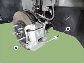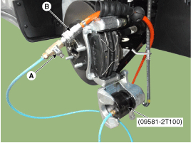 Close the valve (A) of the SST and disconnect the air hose (B); then, open the valve again to get the rest of air out and remove the SST from the caliper.