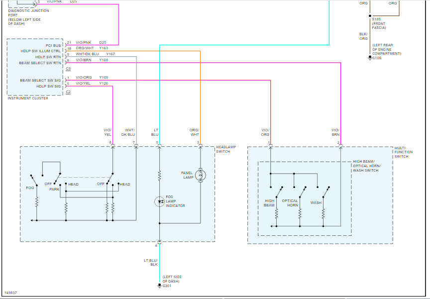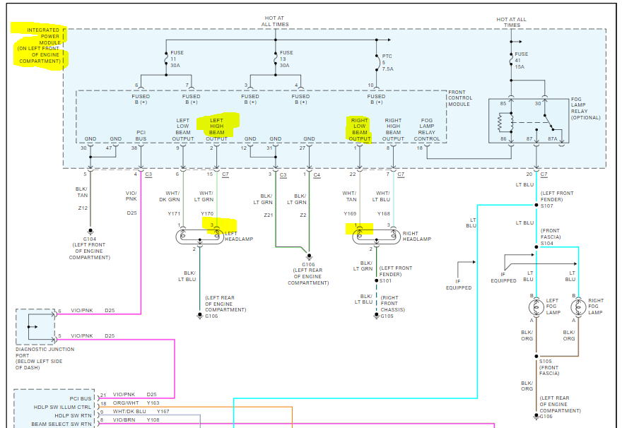 On the passenger side, do the same thing. In this case, turn the low beam on and check the white wire with a tan tracer for power.