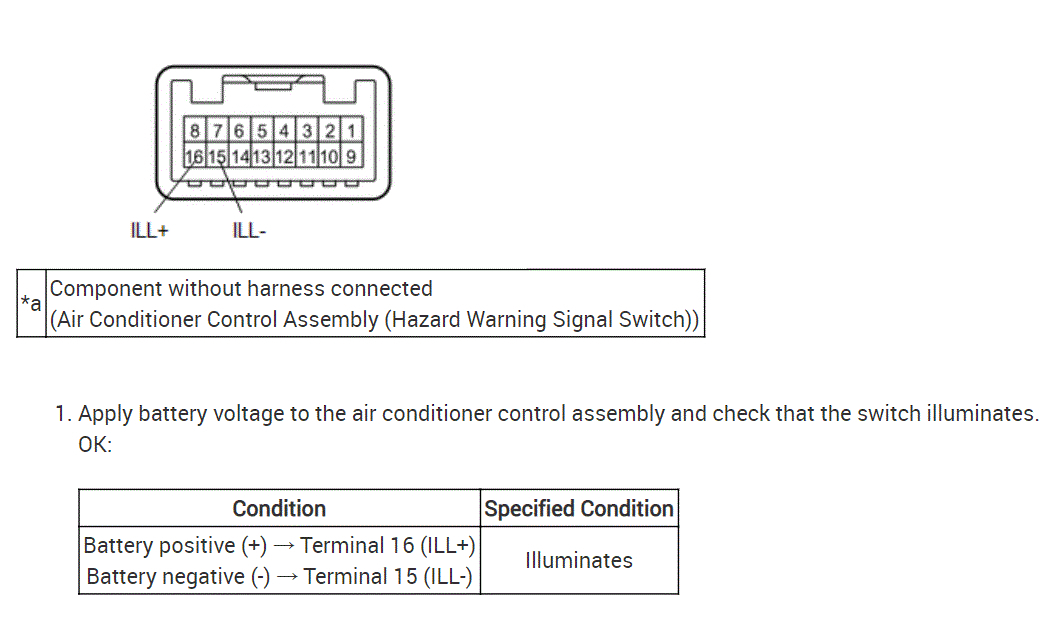 Apply battery voltage to the air conditioner control assembly and check that the switch illuminates.