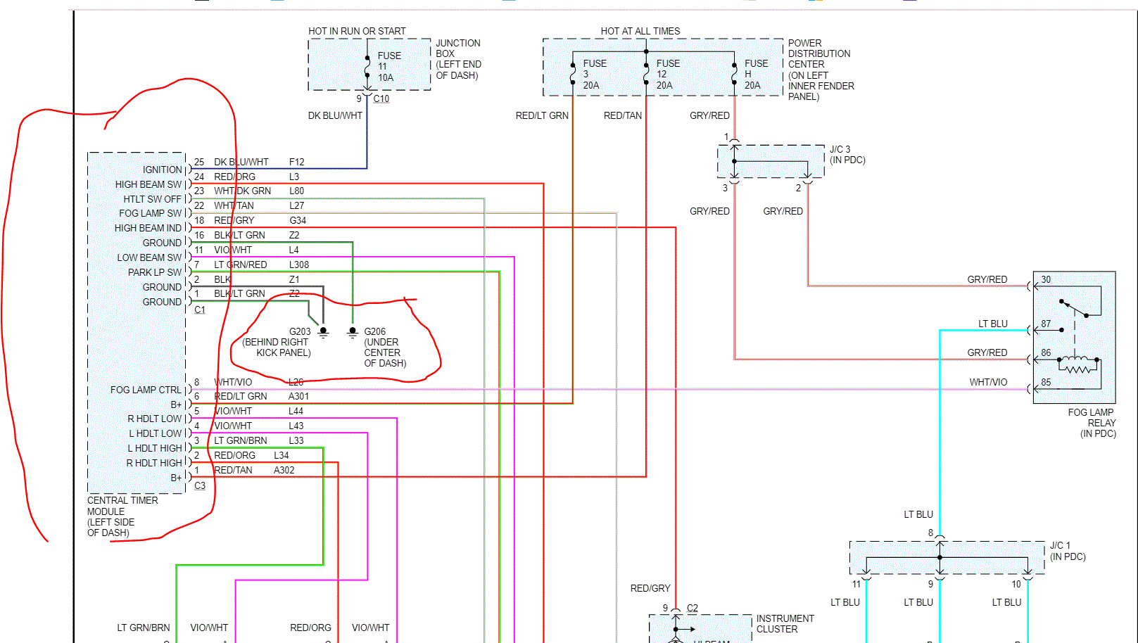 7. Turn the ignition switch to the OFF position. Check for continuity between each of the three ground circuits in the instrument panel wire harness connector (Connector C1) for the CTM and a good ground. In each case there should be continuity. If OK, use a DRB III scan tool to perform further diagnosis of the CTM. Refer to the appropriate diagnostic information. If not OK, repair the open ground circuit(s) to ground (G207 or G208) as required.