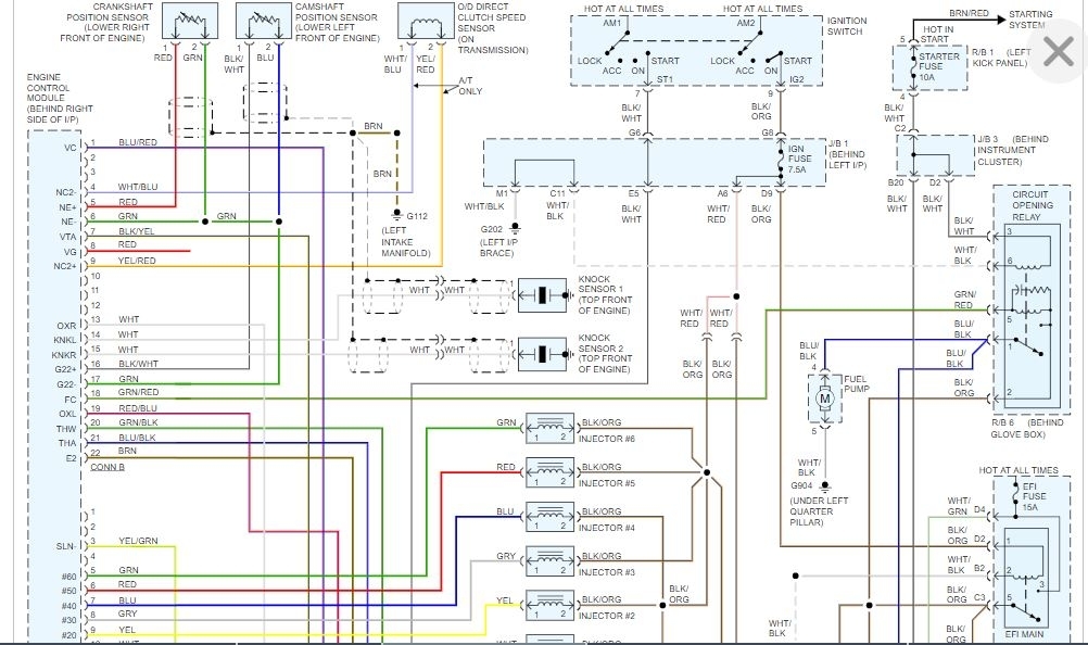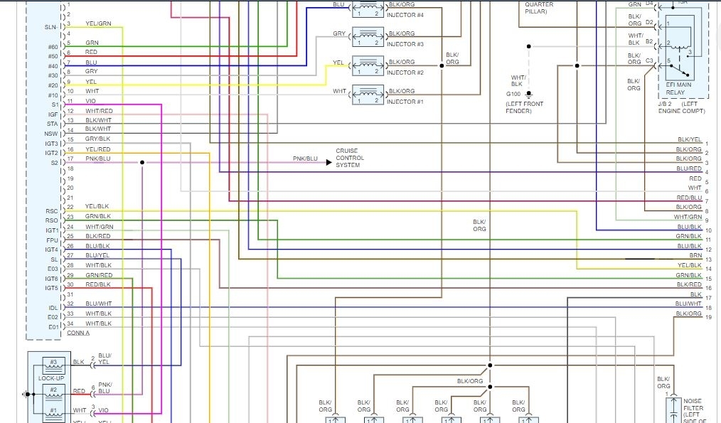 The main relay is energized by a signal from the Ignition Switch. It then supplies battery current from the EFI fuse to the ECM and other components.