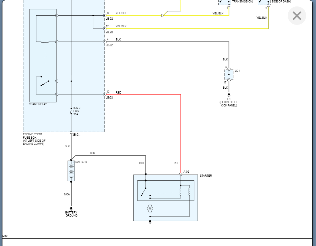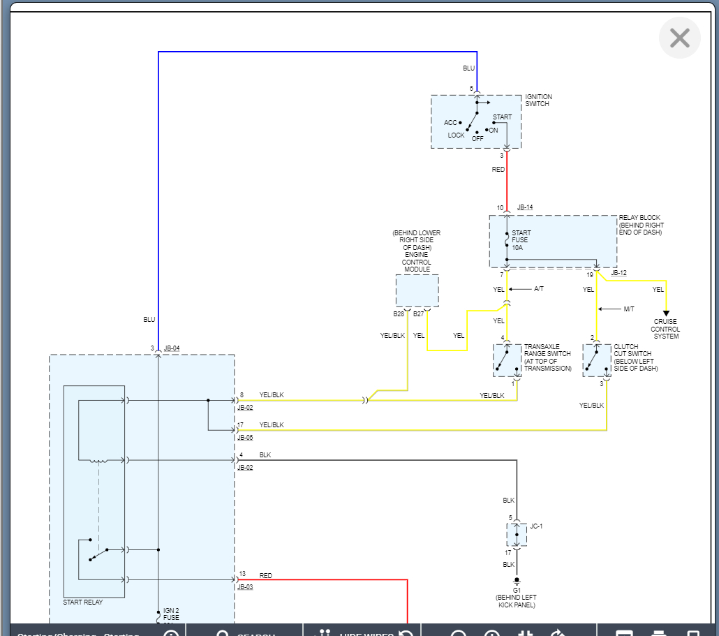 If this is the case, then we need to start with using the wiring diagrams above to test for voltage at the starter on both wires. If you are not getting it then we need to go back in the circuit and find where you are losing it.