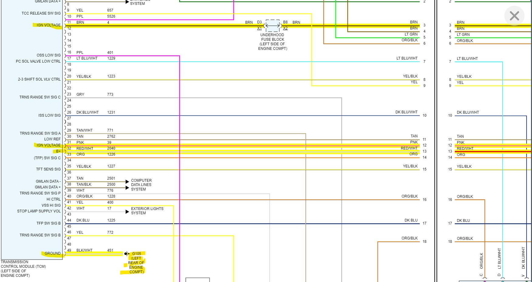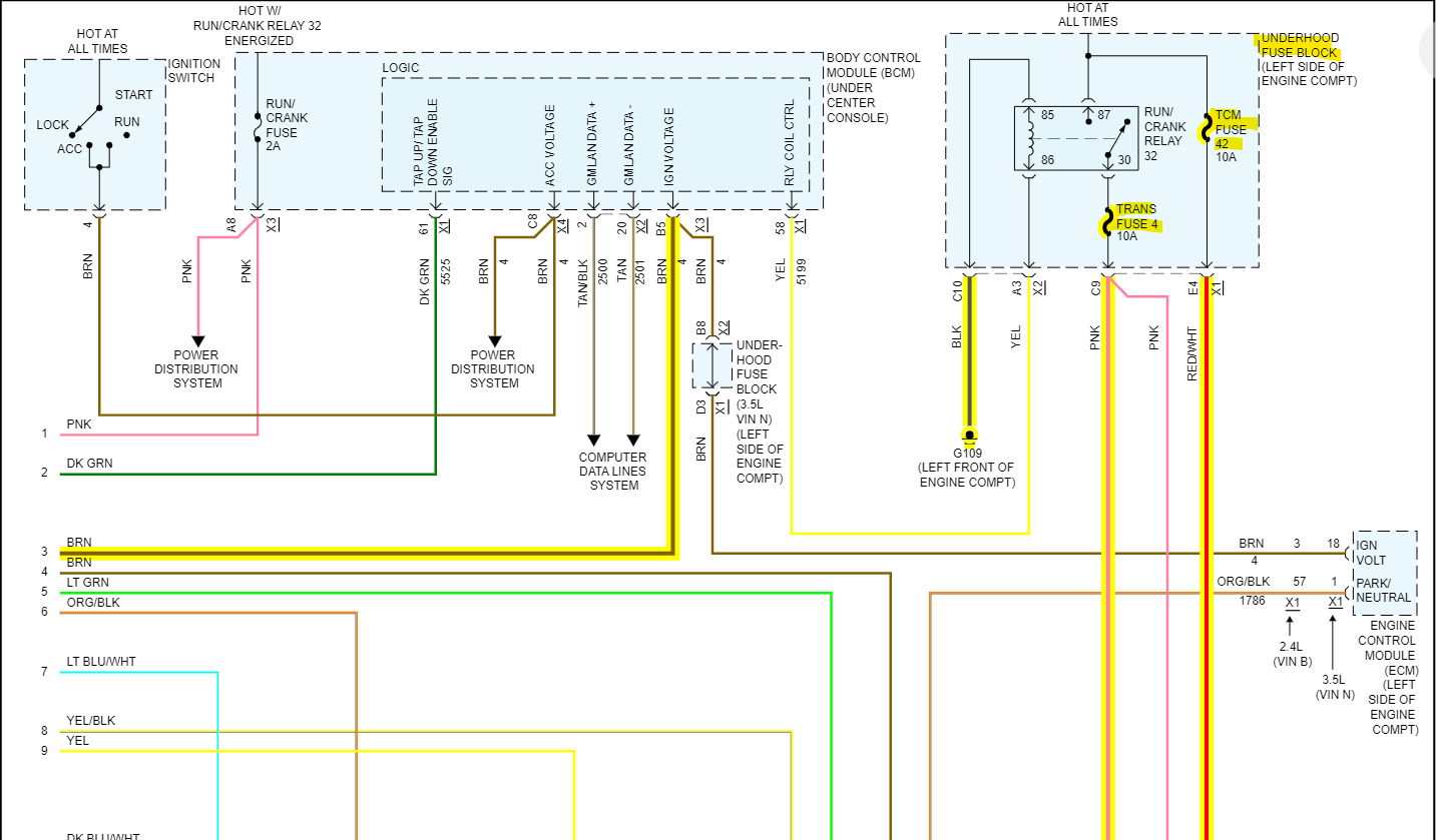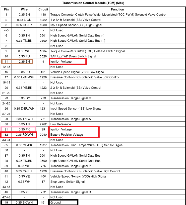 The 2 high speed network wires run through the TCM to get to the ECM, but I'm not sure if its a complete circuit on the TCMs circuit board, but the network comes into the TCM on pins 6 and 7 and goes out to the ECM on 37 and 38. There's a couple power feeds to the TCM, the 1st is an IGN VOLTAGE feed from the BCM directly. The 2nd and 3rd are from the TRANS FUSE 4 10amp and the TCM FUSE 42 10amp in the engine compartment fuse block. You can start by checking those 2 fuses and I'll have some diagrams up for you shortly.