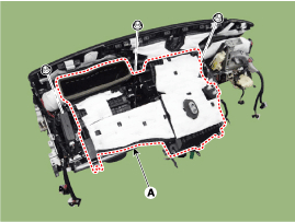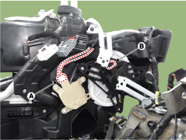 Remove the heater and blower unit (A) from the crash pad (B) after loosening the mounting nuts.