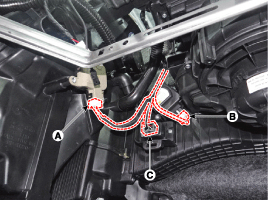 Disconnect the passenger''s side temperature control actuator (A), cluster ionizer connector (B),power mosfet connector (C) connectors and then remove the wiring mounting clips.