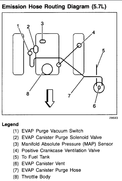 The PCV runs from the valve cover to (I have no idea) a black thing that has a vacuum tube running out of the top. The vacuum hose coming out of the top is broke off flush and I cannot for the life of me figure out where it goes. It has a lot of vacuum and when I put my finger over it the truck shuts off. My original issue is the truck has been running badly. I had a scan run and says number five cylinder misfire. I have recently replaced plugs, wires cap and rotor. I have good spark on number five and a brand new plug. So in my mind it must be a fuel issue. This morning i decided to put a new injector in the number five cylinder. In the process of taking off the upper intake I broke the cooling line off in the intake, which took a while to fix with out damaging the threads. I ended up fixing a couple other dry rotted lines but have two I am struggling with. By the way, the truck is running extremely rough so I do not know if the injector solved anything but I need to fix the vacuum issues so I can continue the illusive misfire saga. My Monday would really great if I could learn something useful.