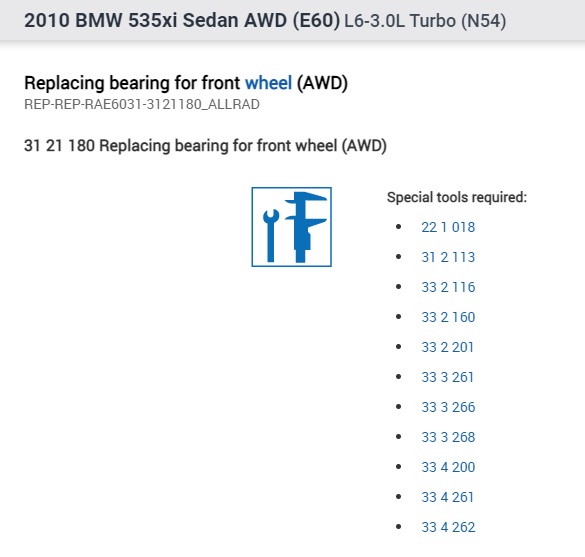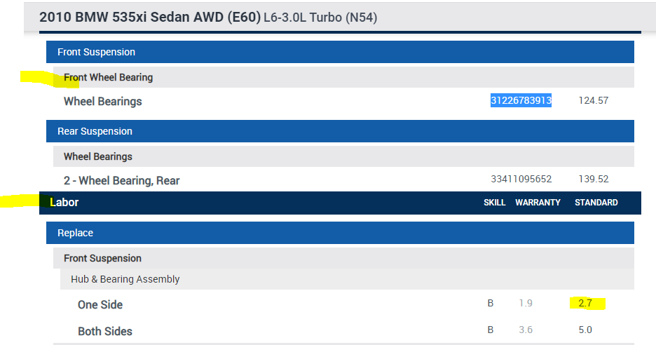I don't know if you are interested, but I did include the OEM part number for the bearing and the labor time to replace it. See pic 1 below. Additionally, the remaining pictures are the directions for replacement.