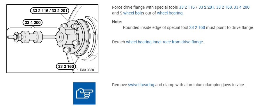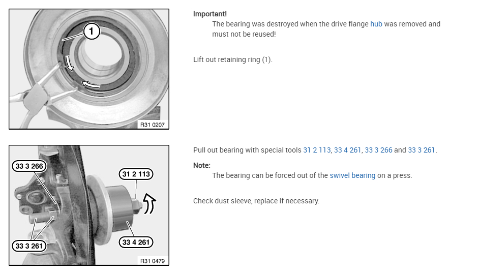 If you look below, I attached the directions for the removal and replacement of the bearing. Take a look through them and let me know if you have questions.