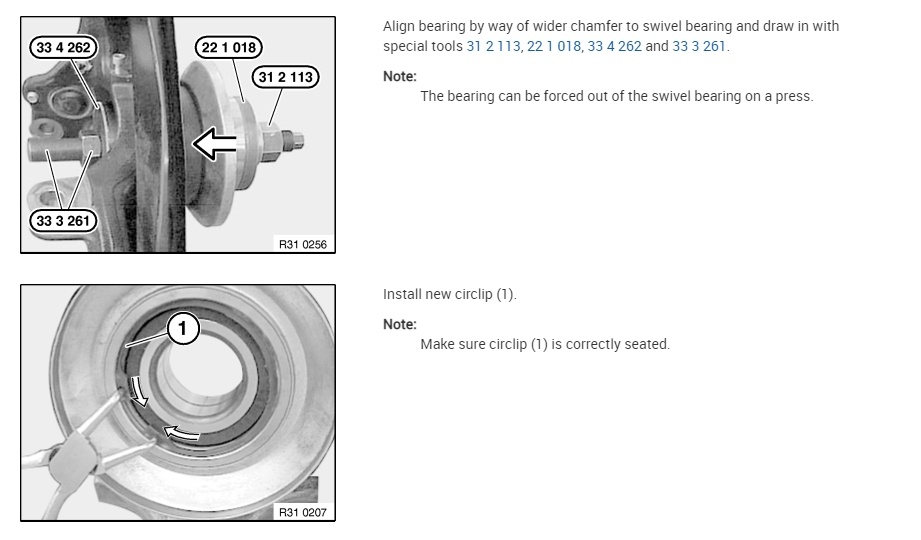To replace the bearing will require some specialized tools. For example, you will need a press to both remove and install the new bearing into the steering knuckle assembly.