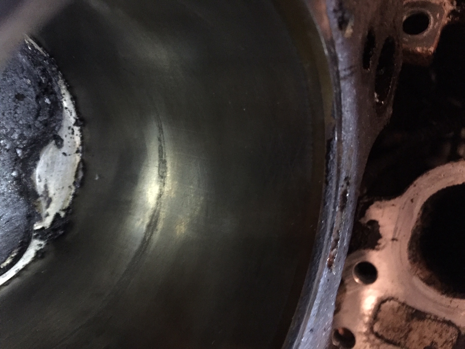 Thanks again Joe! Okay, I took a fresh look this morning at the block and head and think I may have found a hairline crack in the number three cylinder. It's very hard to photograph but I attached two images. The walls are very uniform in finish except around the one horizontal portion shown. Is this what a crack might look like? I wish I could get in there with magnification.