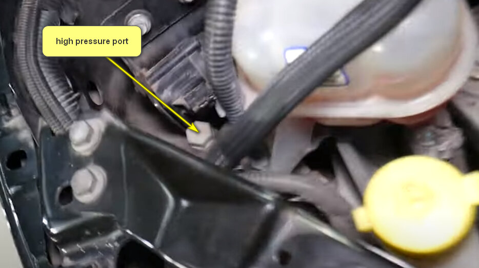 On the Fiat 500 the high-pressure port is located next to the coolant expansion bottle. see image 1
