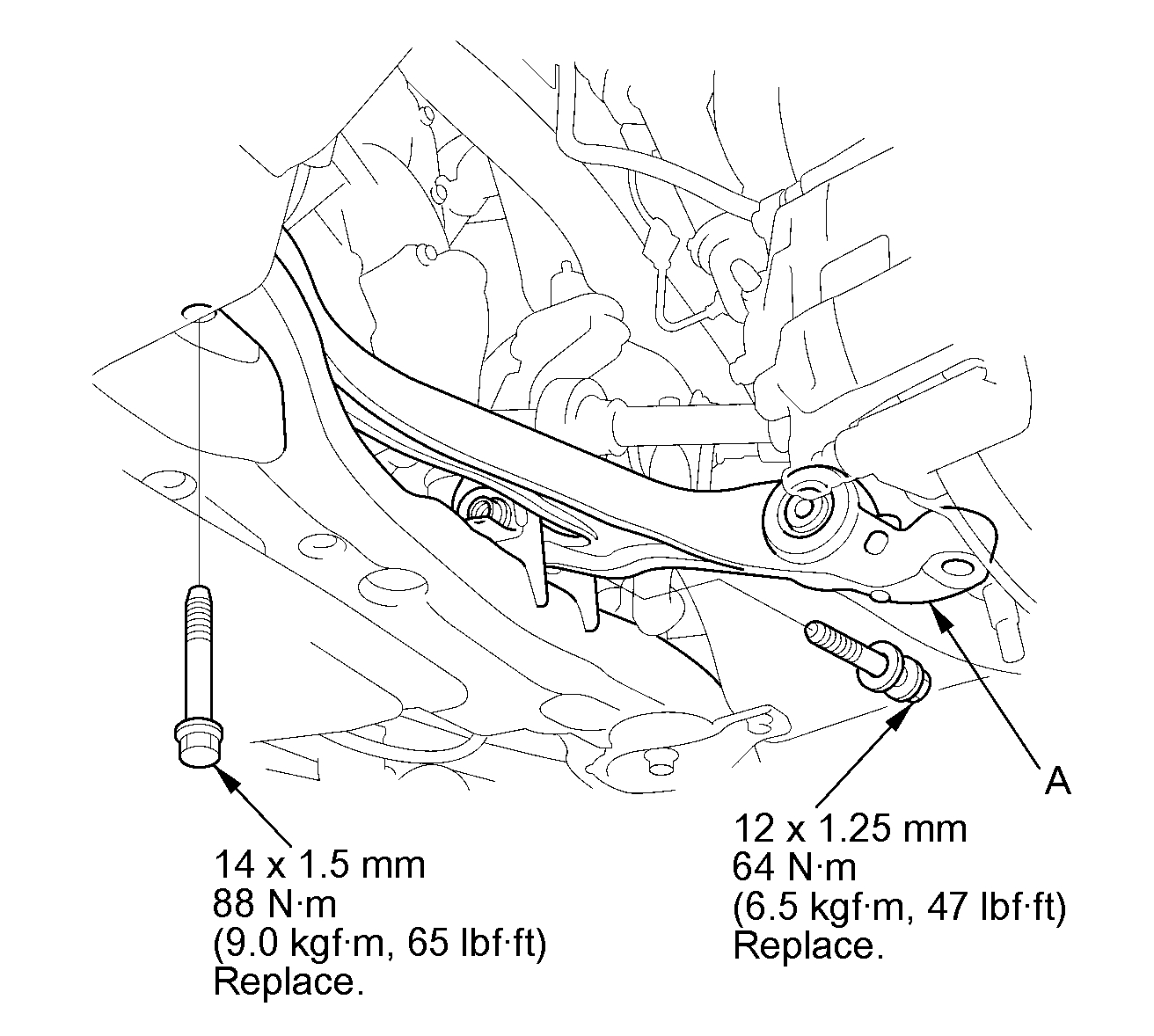 7. Remove the lower arm mounting bolts, and remove the lower arm (A).