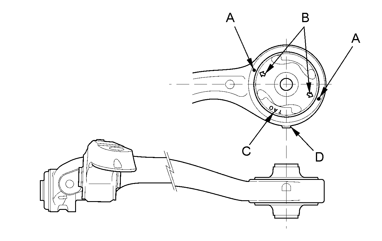 NOTE: The compliance bushing has a specific installation position. Turn the lower arm so that its bottom side is up. Position the bushing identifying mark (C) face up and near the tab (D) on the lower arm. Then align the bushing aligning marks on the bushing and the lower arm.