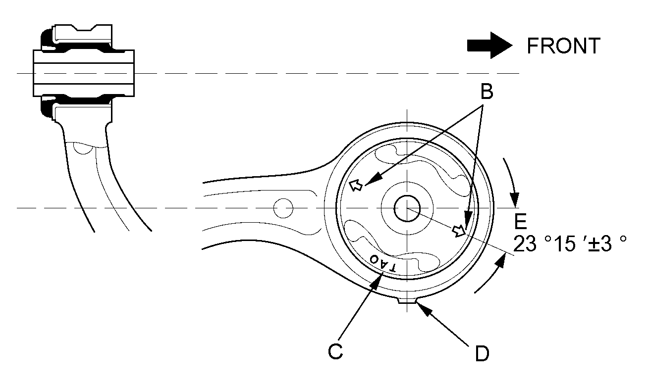 If the alignment marks are gone, align the angle (E) between the lower arm and the bushing as shown.