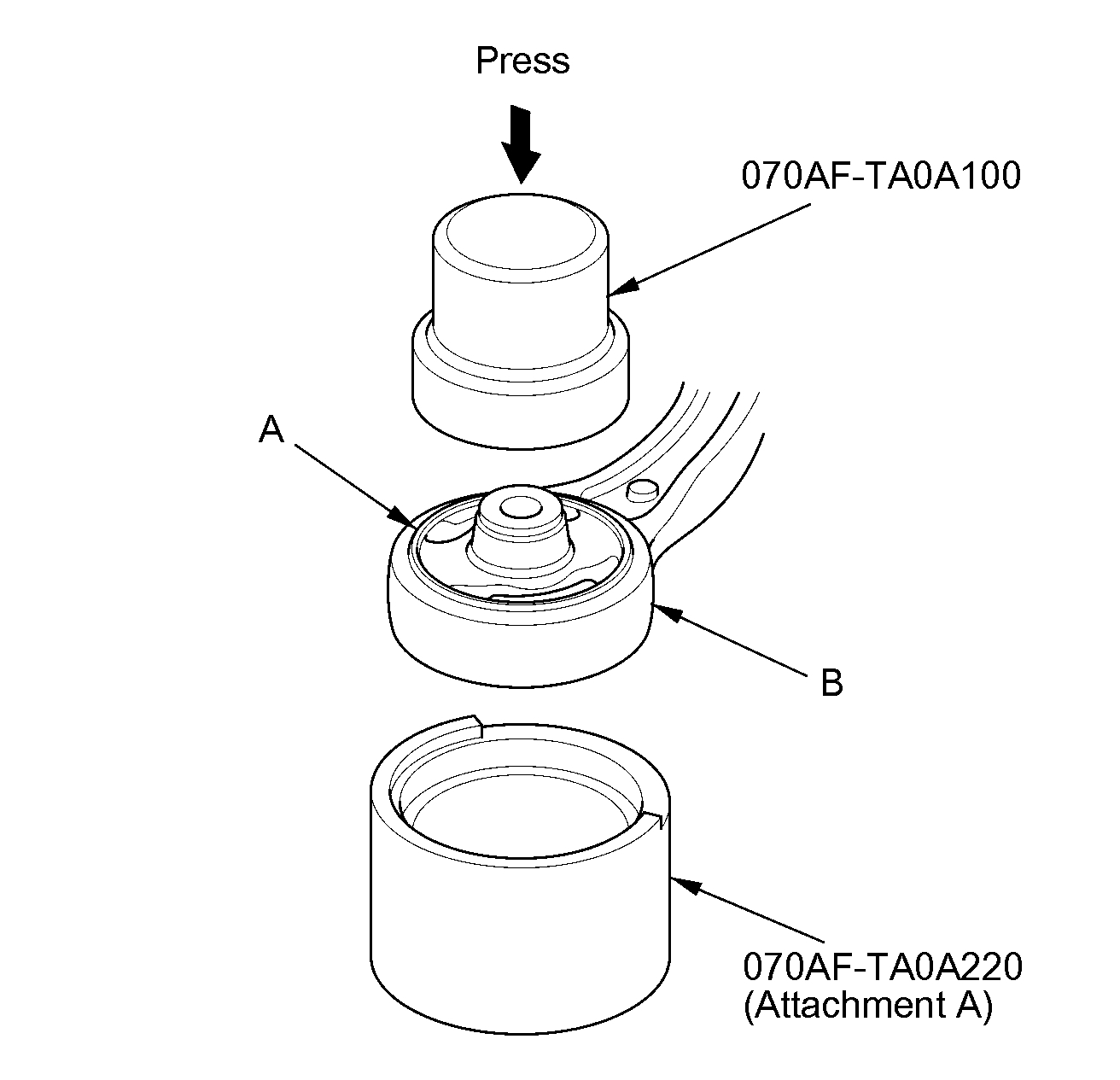 3. Press out the compliance bushing (A) with the bushing driver, the bushing receiver set (attachment A), and a hydraulic press, and remove the bushing from the lower arm (B).