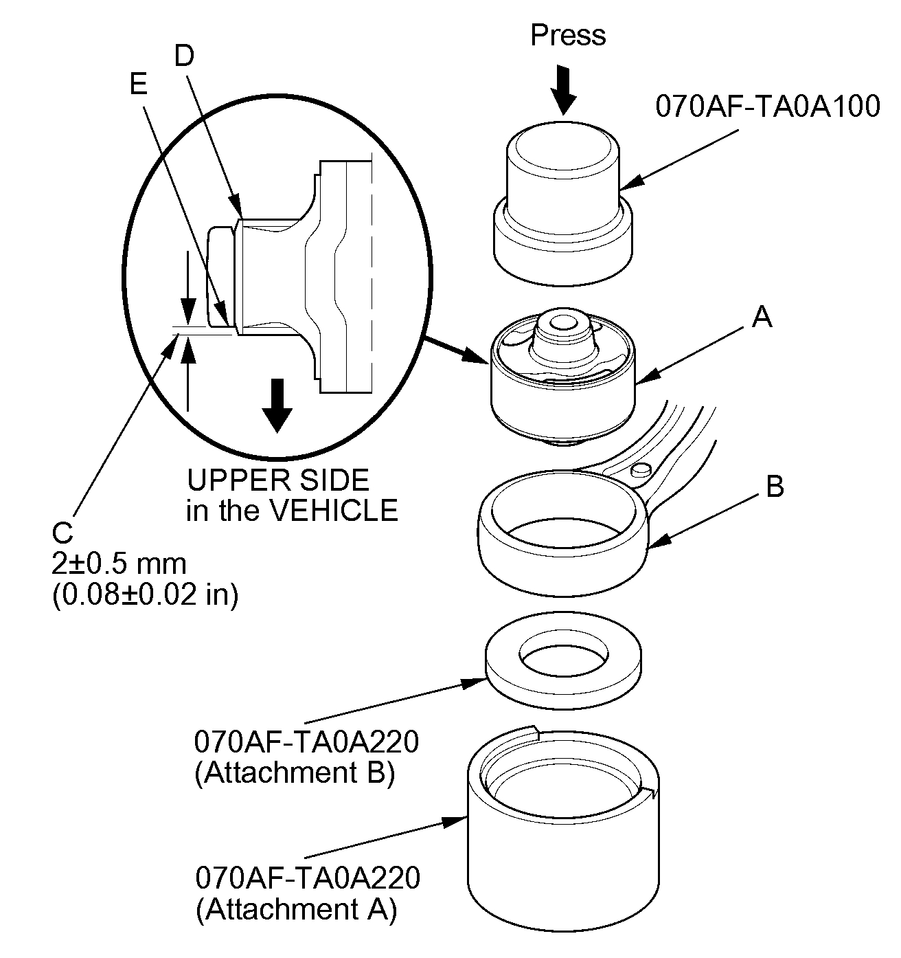 - After installation, check the protrusion (C) of the bushing outer sleeve (D) through the lower arm bushing hole (E).