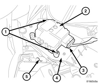 1. Position the mode door actuator (2) to the actuator mounting bracket (4) located on the driver side of the air distribution housing (5). Make sure the actuator output shaft is properly aligned to the door linkage. If necessary, rotate the actuator slightly to align the splines on the output shaft with those in the mode door linkage