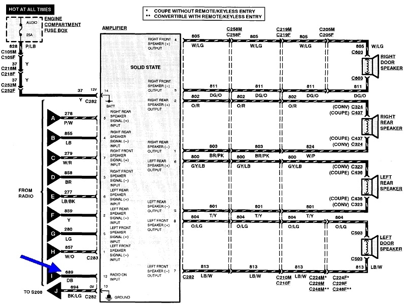 Updated head unit to replace two piece factory AM/FM/CAS/CD with modern DBL-DIN Bluetooth LCD unit. Retained factory Mach 460 amplifiers and speakers. Connected all as per diagrams on wiring kit from SOCHE but no sound from door or rear speakers, only top (A-Pillar) door speakers. Plugged stereo into another vehicle and it worked fine. What am I missing in this car? Please help.