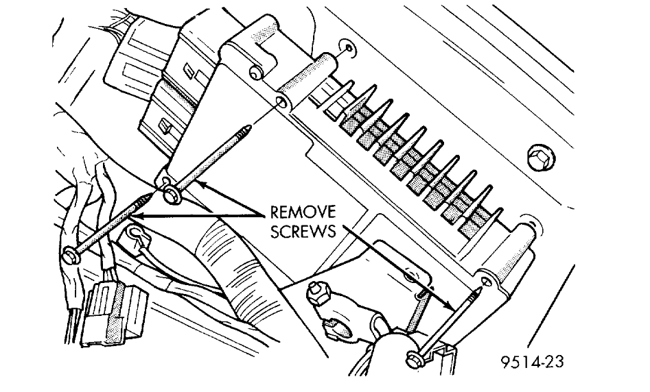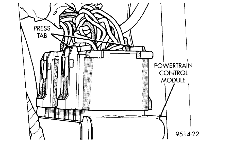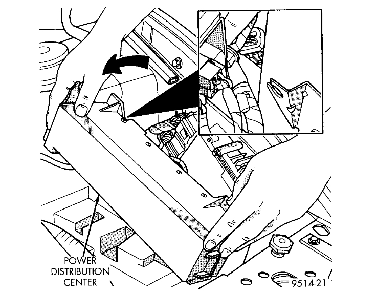7. Pull PDC rearward to remove from front bracket. Lay PDC aside to allow access to Powertrain Control Module (PCM).