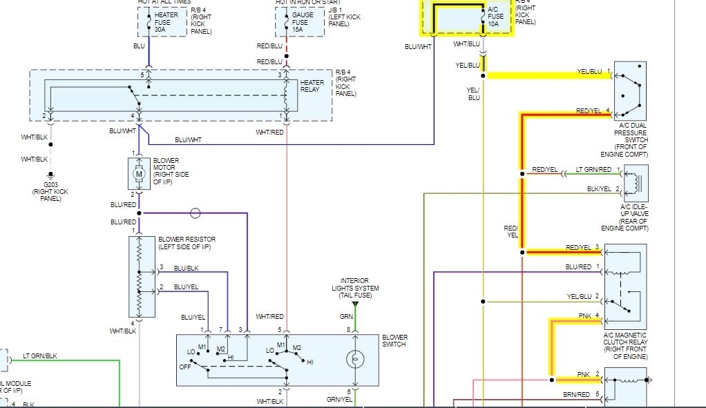 The system was vacuumed and recharged with gas but the fuse behind the glove box was blown so I replaced it. When I turned on the A/C, the clutch engaged but the fan would only blow hot air into the car. After turning the A/C on and off a few times the fuse blew out again.