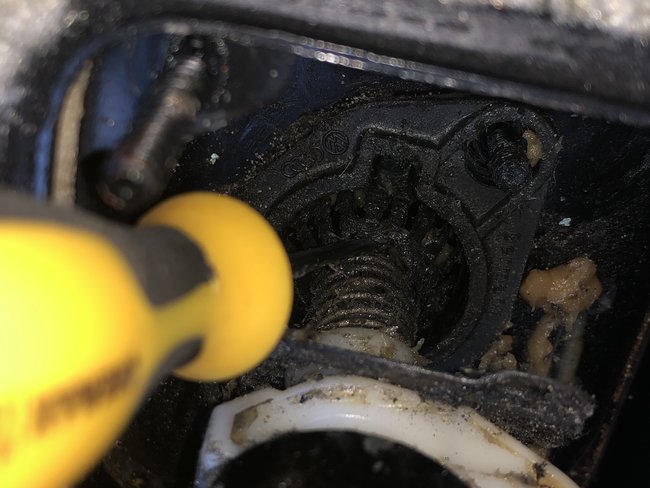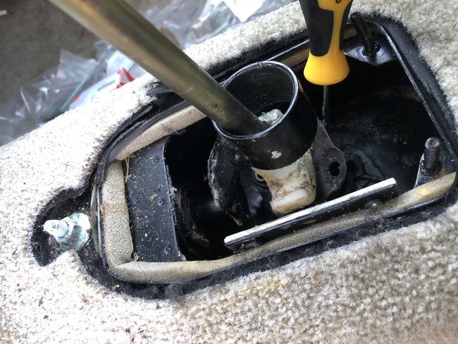 I attached the process on how to disassemble the shifter. Let us know if you need more info. As for the blue bolt, I am not sure I see which one you are talking about. I assume this procedure will show which bolt it is and if it doesn't, can you point to the bolt that you are talking about and we will see if we can identify it? Thanks