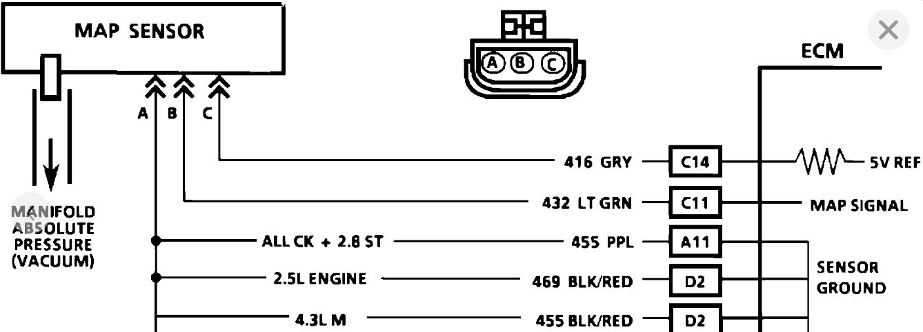 The Manifold Absolute Pressure (MAP) sensor measures manifold pressure (vacuum) and sends that signal to the ECM. The MAP sensor is mainly used for fuel calculation, when the ECM is running in the throttle body backup mode. The MAP sensor is also used to determine the barometric pressure and to help calculate fuel delivery.