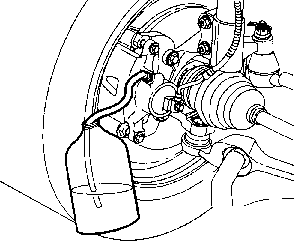 b. Attach transparent hose over bleeder valve nipple. Submerge other end of hose in a transparent container of brake fluid.