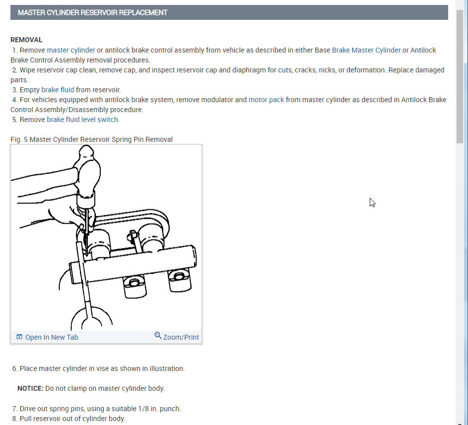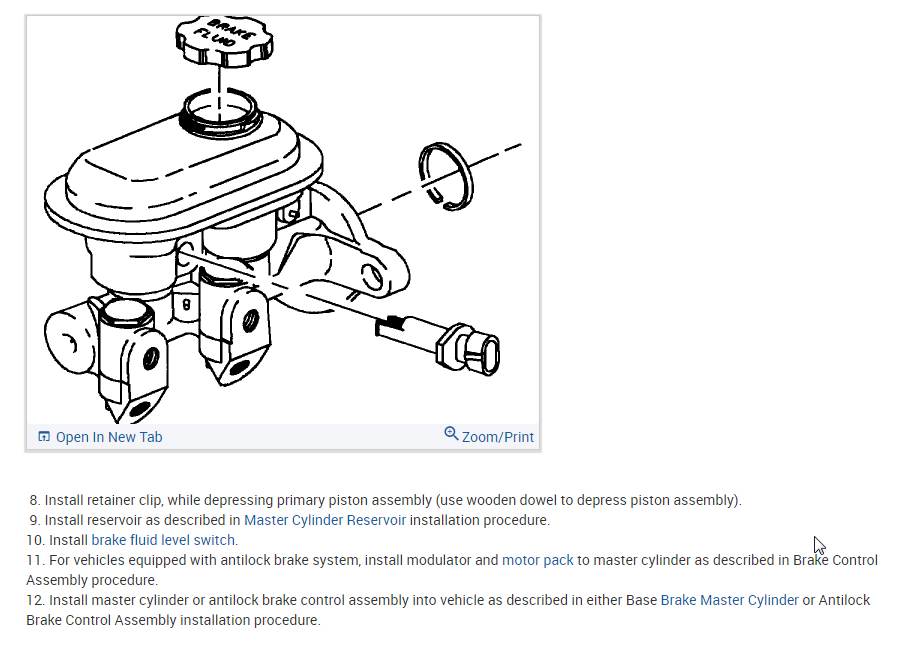 Here are the directions for replacement specific to your vehicle. The attached pics correlate with the directions. After the replacement directions, I will include the directions for bleeding the system. One last thing. Here is a link that shows in general how one is replaced. Look through it because it explains how to bench bleed the new master cylinder. You will need to do that.