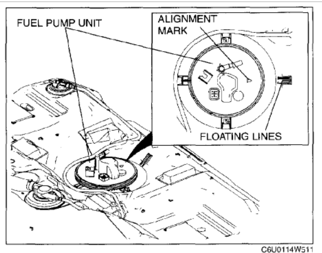 The fuel filter is part of the pump assembly. Once the fuel pump is removed, remove the filter retainer and filter.