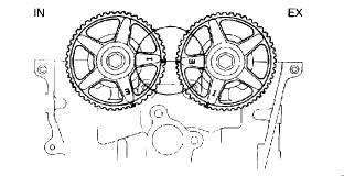 Face the marks (I) and (E) of the camshaft pulley straight up, then align the timing marks with the horizontal surface on the cylinder head.