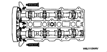 Verify that the camshaft pulley marks are aligned with the timing marks as shown.