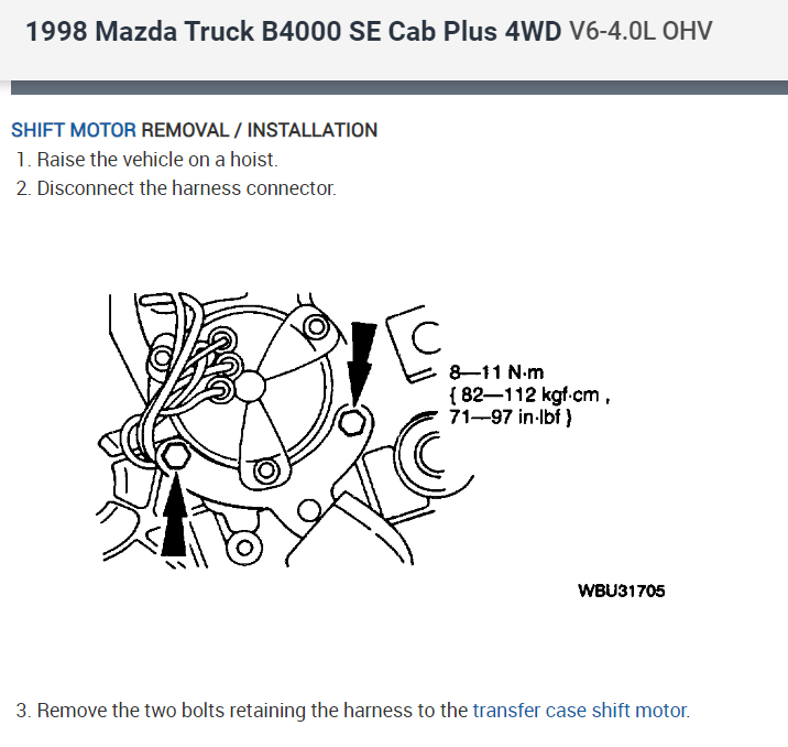 I have a 1998 MAZDA B4000 V6 4x4 with 123,000 miles. Periodically I loose the ability to operate in 4 wheel drive, accompanied by intermittant engaging/disengaging of the drive -- not by my command -- and then I get the 4 wheel drive dash light blinking 6 times on a repeating cycle of about 60 seconds. 1) what's the meaning of the 6 blink code? 2) Is there any place on the web one can go to have answered this question? {local dealer says no, of course} -- WD Goodwin