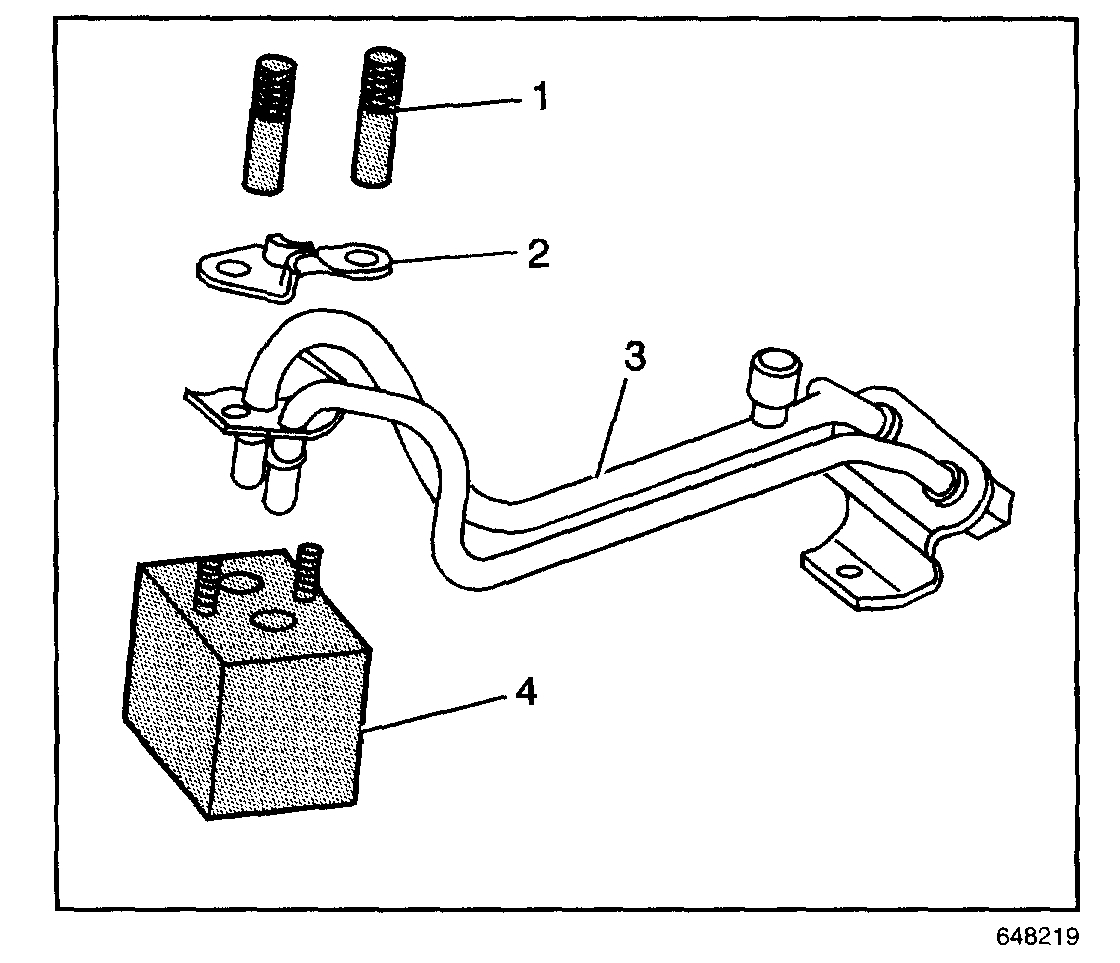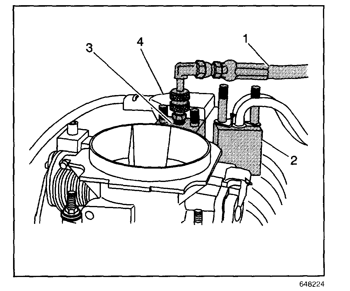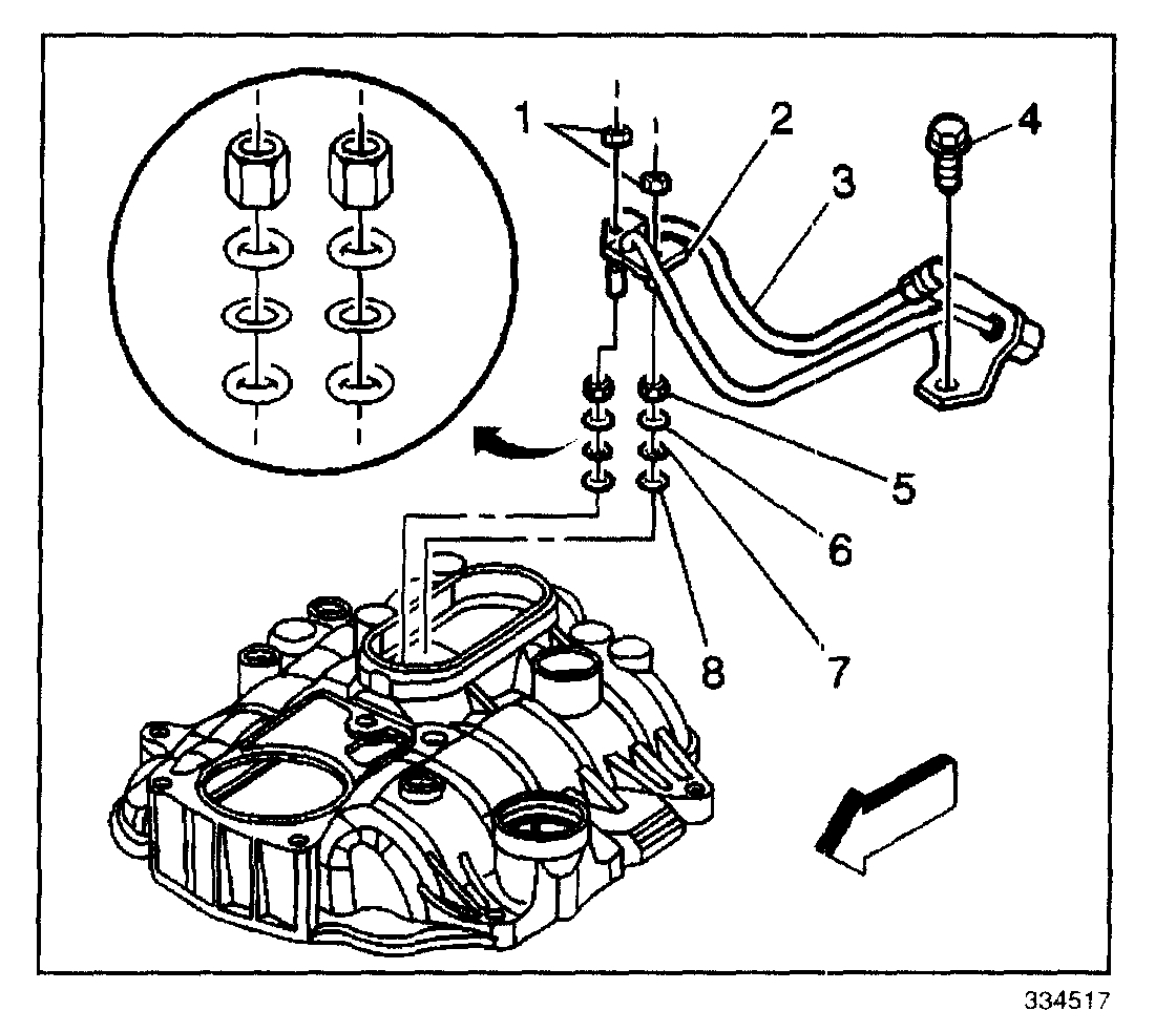 7. Remove the fuel line bolt (4) at the rear of the intake manifold.