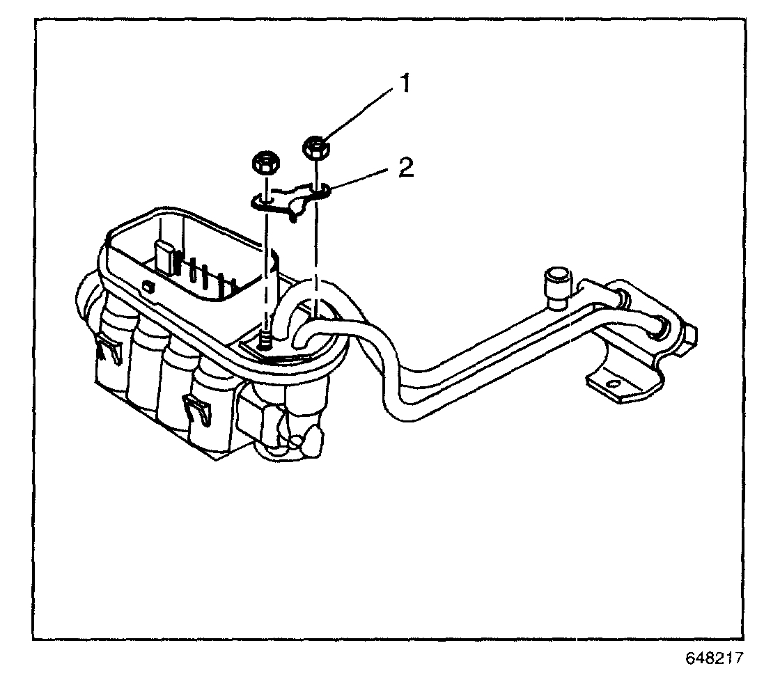 9. Remove the nuts (1) and clamp (2) from the fuel pipe.