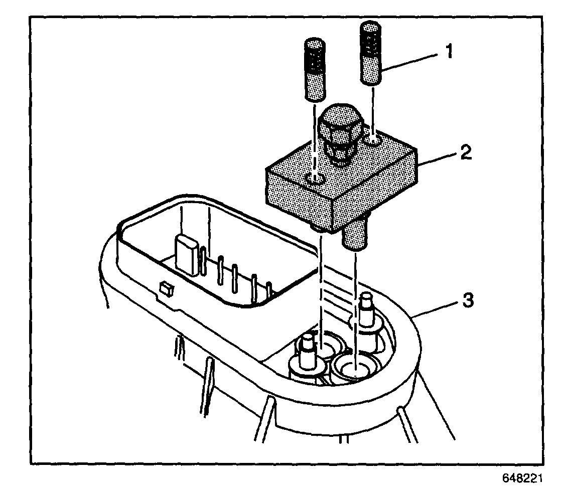 11. Install the J 44466-12 (2) and the J 44466-13 (1) to the metering body and tighten. Make sure that the fuel pipe 0-rings, washer, and spacers are present and in their proper position.