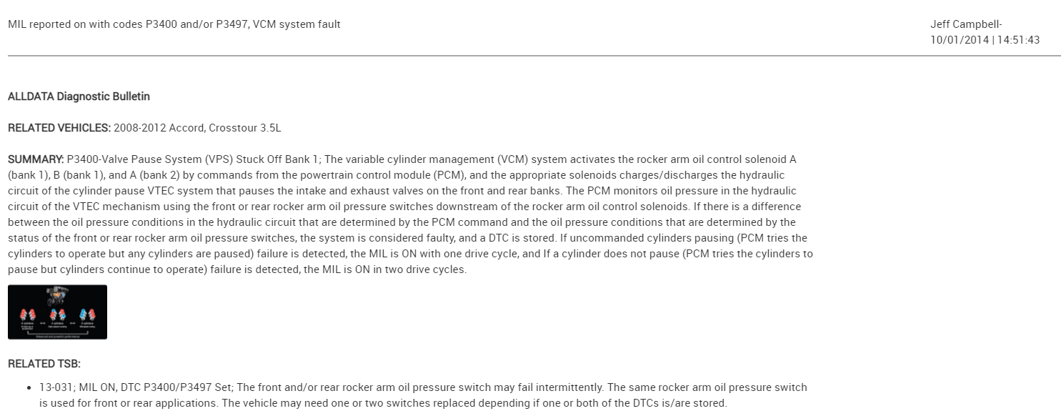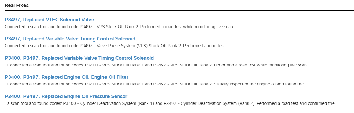I wanted to show you this, here is a small list of "real repairs" due to this code p3497. Just so you can get an idea of what actually happens. The last Honda I had a code for was a similar problem and I diagnosed it as the oil pressure solenoid on the back of the engine. On a road test it was stalling out on the highway doing the same thing yours is probably doing. It's listed here as the VTEC solenoid, some people call it variable valve timing but it's really not what it is. It's a valve closing system to help save on gas.