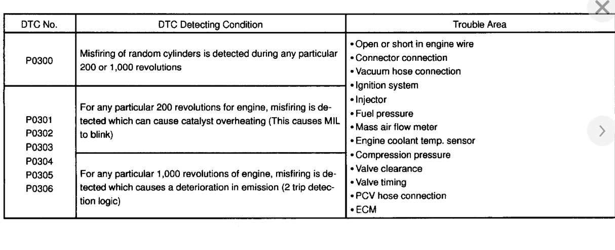 Misfires, code ps300 to 306