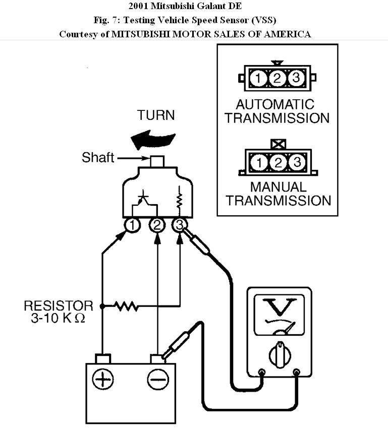 1. Remove VSS from transaxle. Jumper a 3000-10,000 ohm resistor between sensor terminals No. 1 and 3. Connect battery positive voltage to sensor terminal No. 1 and battery negative voltage to sensor terminal No. 2. See Fig. 7.