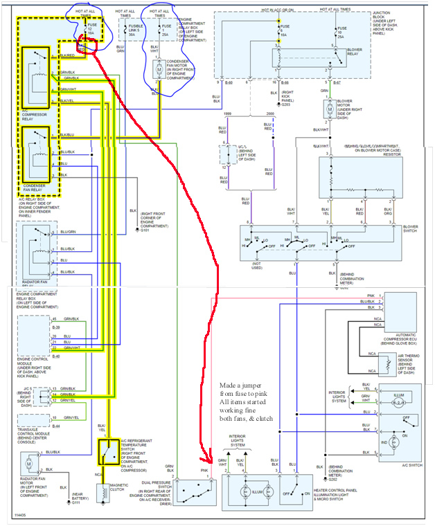 Resolution, cut large paper clip and jump blue and pink wire on harness - seems to work just fine with the engine running, both fans running, compressor engaged.