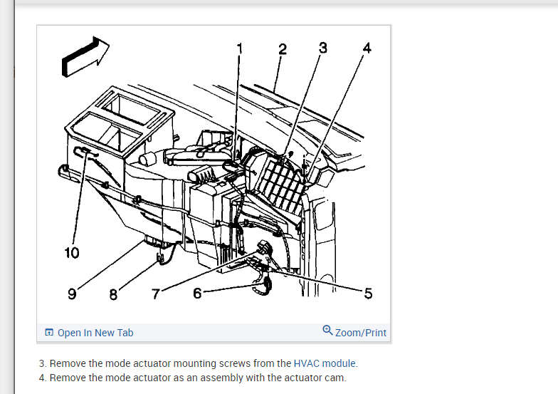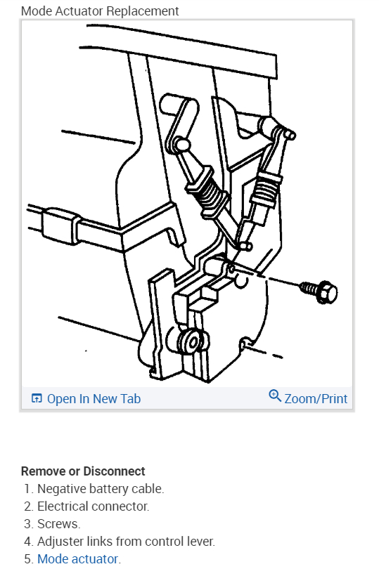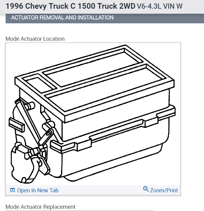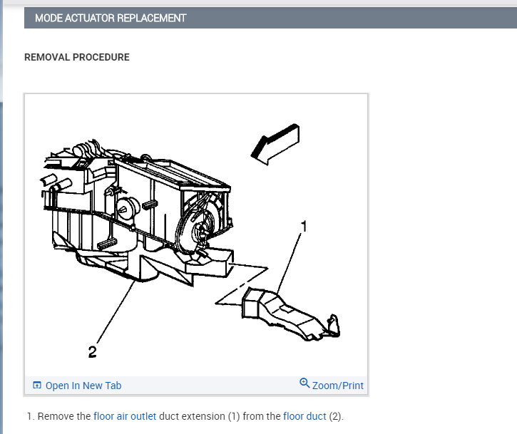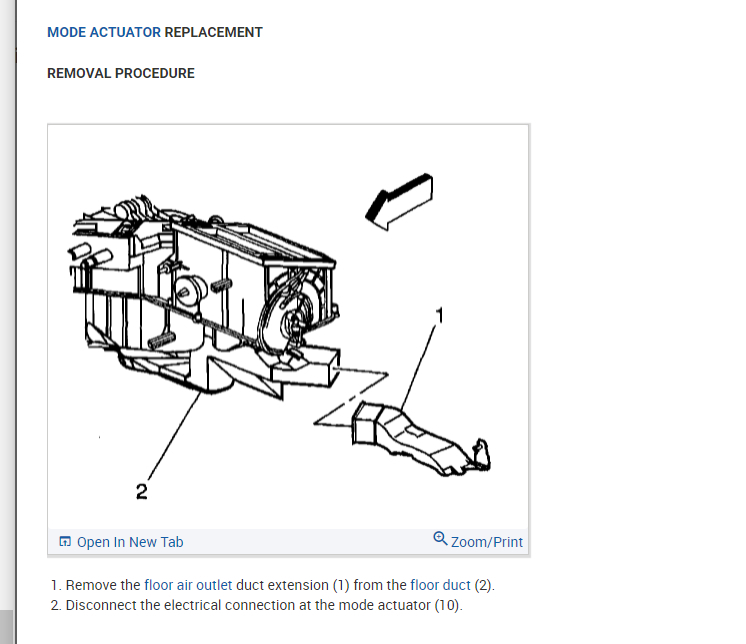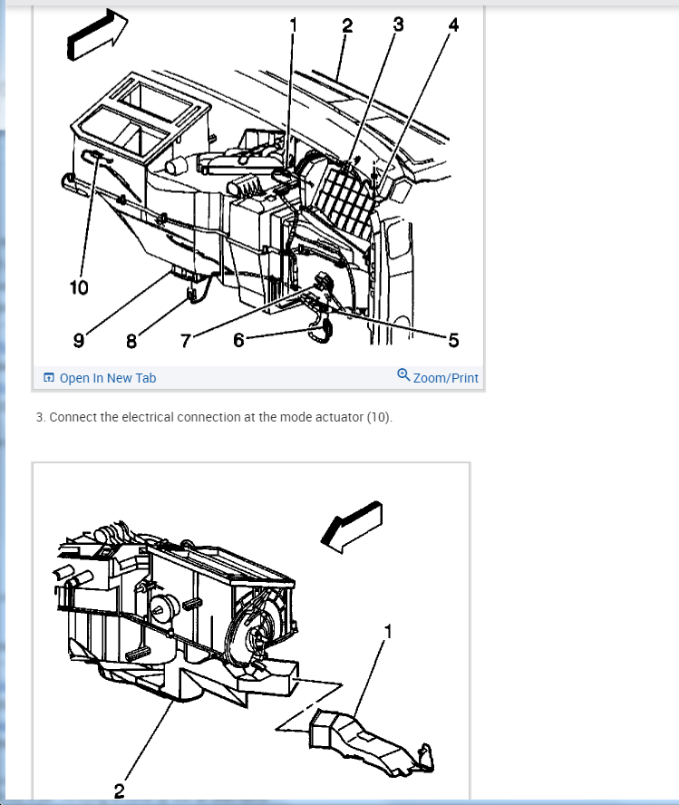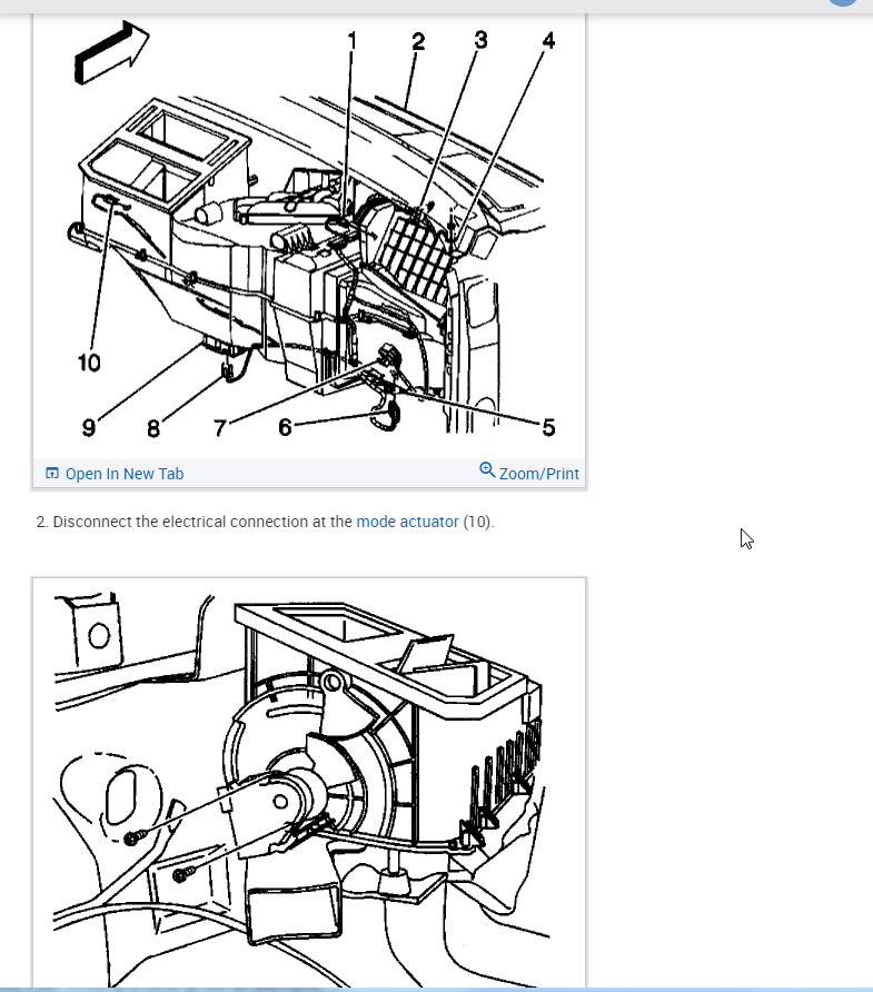 If you look at pic 1, it shows the location of the mode door. What I would like you to do is remove the actuator and check to see if it moves when you change air flow directions. Also, make sure nothing is disconnected or damaged.