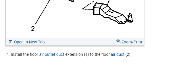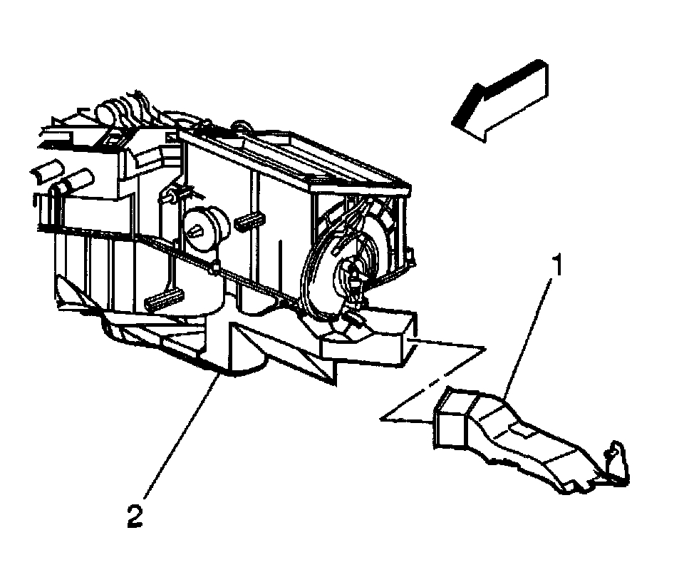 1. Remove the floor air outlet duct extension (1) from the floor duct (2).