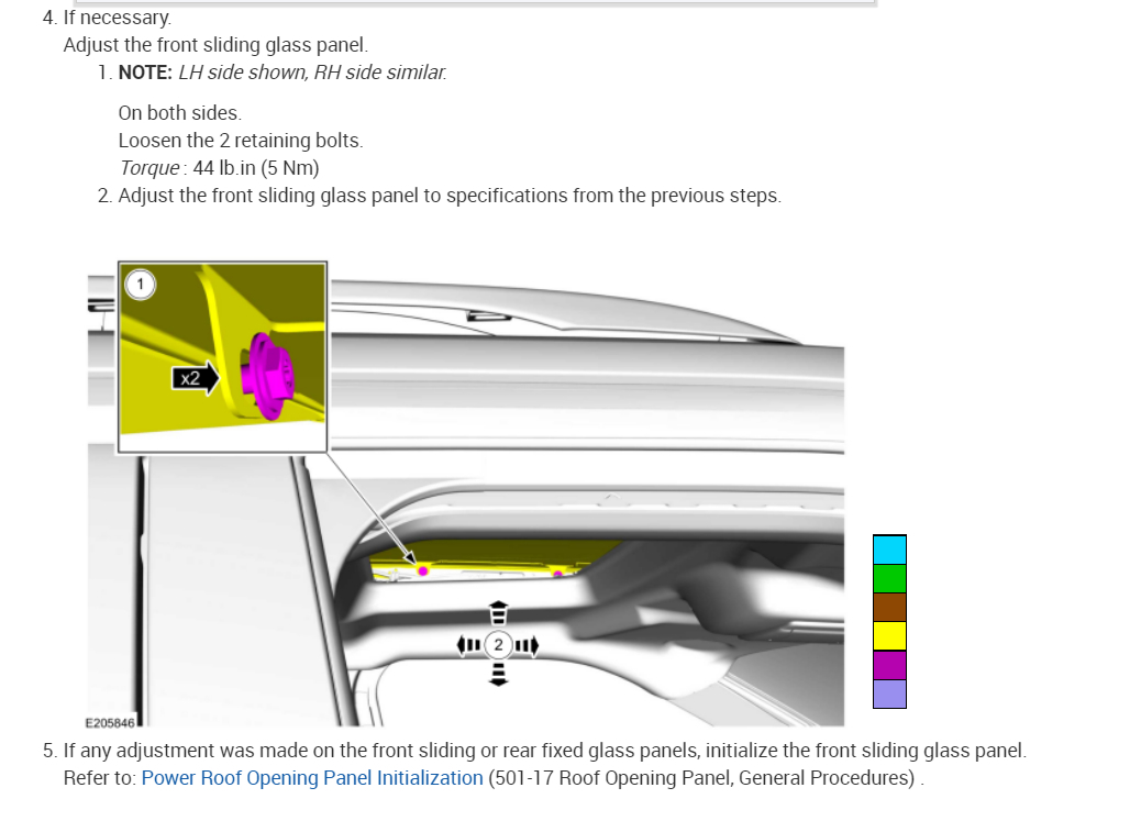 NOTE: The roof opening panel motor must be initialized when repairs are carried out on the roof opening panel system, including any time the roof opening panel motor has been removed, the roof opening panel glass (fixed panoramic or sliding) has been removed or adjusted, or if the roof opening panel frame has been removed.
