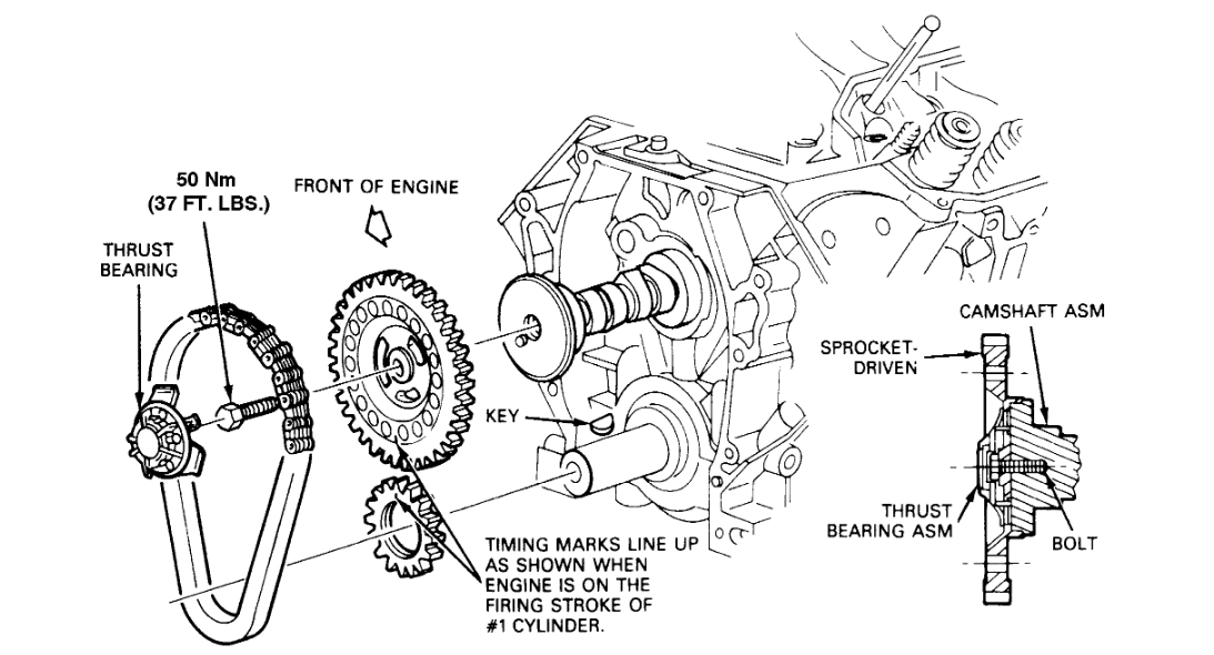 3. Cam sprocket, crank sprocket and timing chain over crankshaft so that the timing marks are aligned.