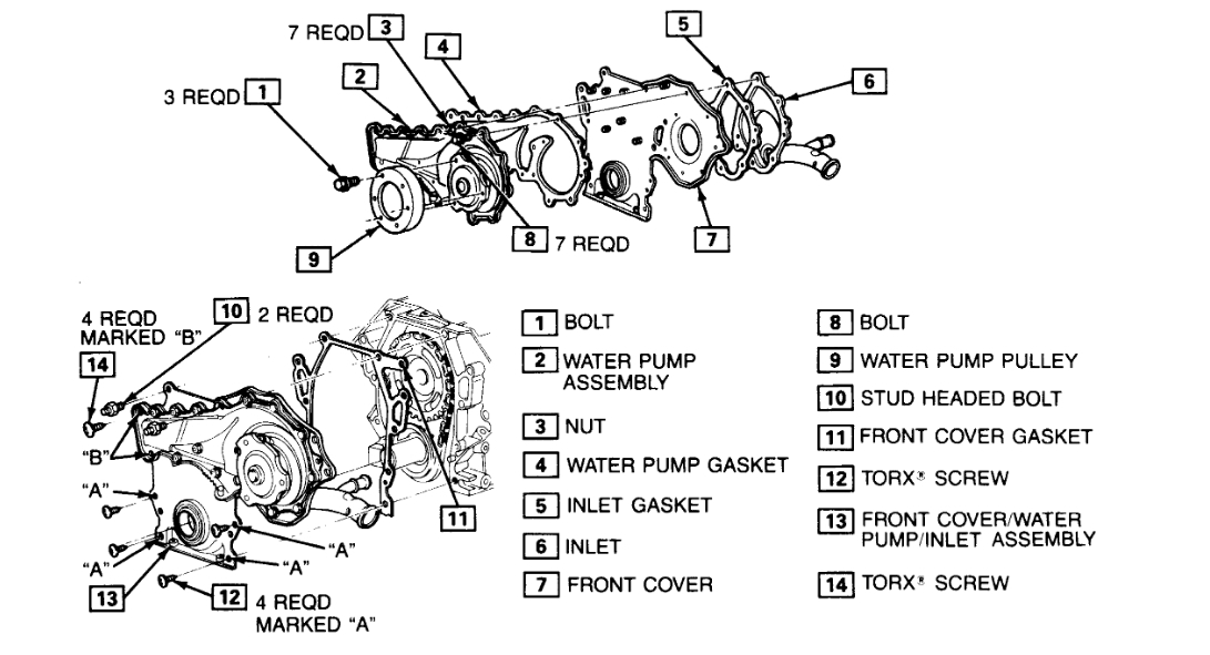 12. Start engine and check for leaks at front cover, water pump and water inlet.