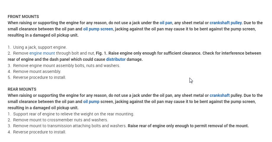 Wondering what Alldata says about doing these. The manual I have just says to jack up the engine by the oil pan and zip them off. Also torque for the through bolt is around 70ft lbs??